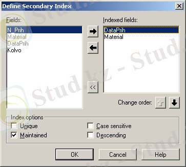 Жаңа индексті анықтау үшін, Define батырмасын басамыз. Көрінген диалогтық терезеде Fields өрісінде біз анықтаған кестенің тізім мазмұны көрсетіледі. Index Fields өрісінде құрылған индекске кірушілерді сақтау үшін тағайындалған. Fields тізімінен Index Fields тізіміне нақтылы өрісті көшіріп алу үшін оң бағдарша бейнелеуі бар батырманы басу керек. Өріске тізімді жүйелілі қосу маңызды, өйткені ол тізімде өрістің алмасу ретін анықтайды. Index Fields тізіміне керек өрістерді таңдаған соң ( сурет . 14), Ok батырмасын басамыз .