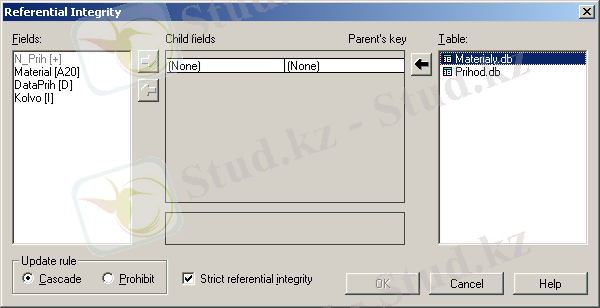 Prihod кестесін ( элемент File менюі Table Open ) ашып және кестені өзгерту құрлымы режіміне ( Table Restructure ) кіреді. Table Properties түсетін тізімінде Refrential Integrity элементін таңдаймыз және Define пернесін басамыз. Көрінген диалогтық терезеде ( сурет . 17) Fields тізімінде Prihod кестелерінің өрістері көрсетілген, ал Tables тізімінде - primer базасының кестелері көрсетілген .