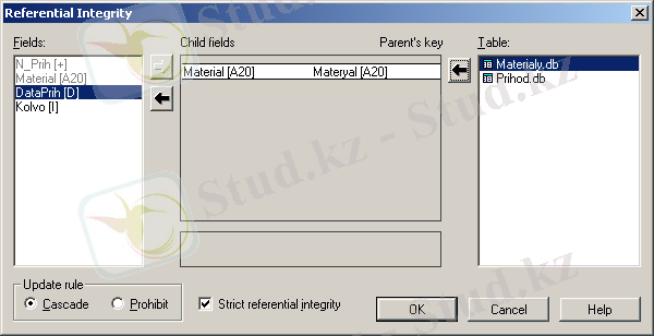 Update rules айырып қосқыштар Materialy кестесінде жазбаларды жою немесе Materialy кестесінде өріс байланыс мәнінің өзгеруін Prihod кестесінің каскады әсерін анықтайды: