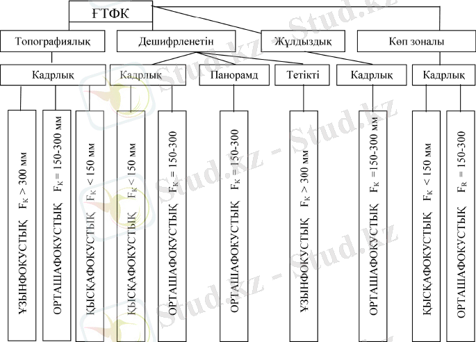 Ғарыштық түсіріс фотокамераларын жіктеу (ҒТФК) олардың мақсатымен, түсірістер жүргізу әдісімен, геометриялық параметрлермен анықталады (4. 1-сурет) .