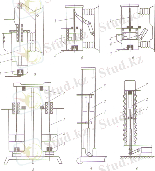 6- сурет. Аз майлы ажыратқыштардың конструктивтiк схемалары: 1-доға өшiргiш байланысулары; 2-доға өшiргiш камерасы; 3-жылжымайтын байланысулар; 4-жұмыс байланысулары.