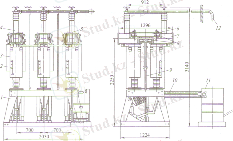 1-негіздік; 2-полюс аралық қоршау; 3-бак; 4- майайырғыш; 5-магнитөткізгіш; 6- траверса; 7- қорапты профилдің кірісі; 8- басты түйіспелердің пышақтары; 9-штангі; 10- жетектің тартпасы; 11-жетек; 12- газөткізгіштің шығару ұшы.