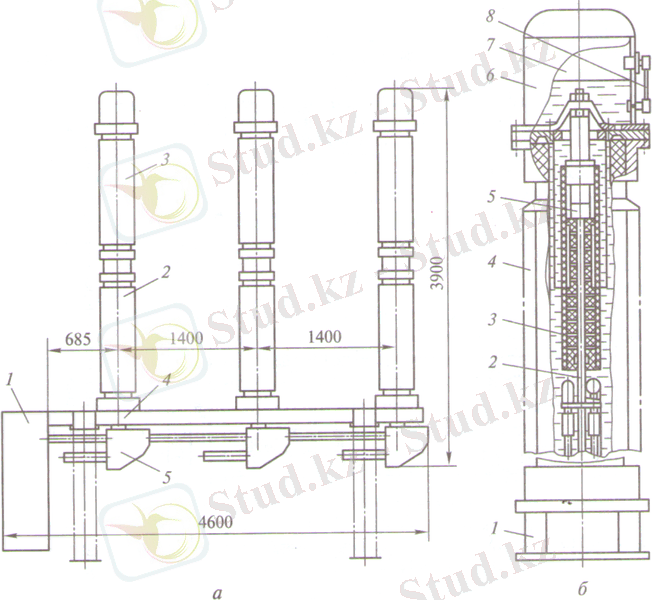 а-жалпы түрі; 1-серіппелі жетек; 2-тірек изоляторы; 3-доға сөндіруші құрылғы; 4- ажыратқыштың негіздігі; 5-басқару механизмі; б-доға сөндіруші модуль; 1- ток айдаушы; 2- жылжымалы түйіспе; 3-доға сөндіруші камера; 4- фарфорлы қуысты изолятор; 5- жылжымайтын түйіспе; 6-колпак; 7- буферлік көлем; 8- май деңгейін көрсеткіш.