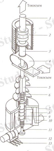 Токтың түйіспелерге мыс стержндері 4 және 5 көмегімен беріледі. Жылжымалы түйіспе жоғары фланецке 6 силфонның 7 көмегімен бекітіледі. 8 және 9 металл экрандары электр магниттік өрісті тегістеуге және керамикалық корпусты 10 доғаның жанғанында пайда болатын металл буларынан қорғауға қызмет етеді. Экран 8 камераның корпусына сақинаның 11 көмегімен бекітіледі. Үстіңгі түйіспеге алға жылжу корпуспен 12 қамтамасыз етіледі. Жылжымалы түйіспенің жүрісі 12 мм -ге тең.