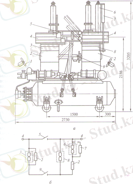 а- жалпы көрiнiсі; б- электр функционалдық сұлбасы; 1 - үрлеу желдеткiш; 2 - резистор; 3, 8- доға өшiргiш камералары; 4 - түйiспелердің шығыстары; 5 - бөлгіш; 6- резисторлы 7 қосалқы камера; 9 - айырғыш.