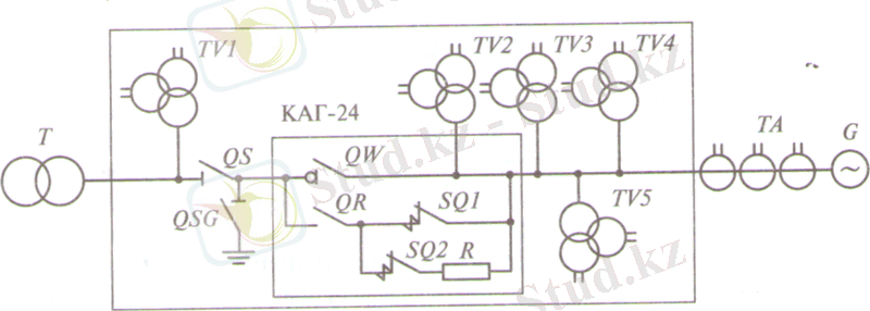 КАГ-24 құрылғысы кернеу генераторларының комплекстік ток өткізгіштерінде құрылады. 11-суретте КАГ -24 құрылғысының полюстарының электрлік схемасы көрсетілген. Әрбір полюстардың TVтипті ЗНОЛ-0, 6-24УЗ бес QW кернеу трансформаторлары бар бір жерлестіргішті QSС басты тізбектегі QS бөлгіші құрамына кіреді.