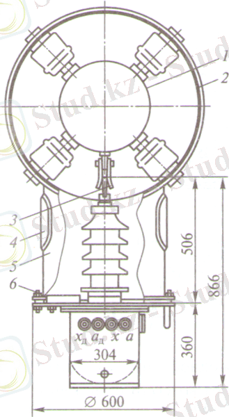 8-сурет. НКФ-110 кернеу трансформторы. а-сұлбасы; б-конструкциясы; 1- жоғары кернеу кірістері; 2-май қеңейткіш; 3- фарфорлық көйлек; 4- негіздік; 5- НН ұштарының қорабы