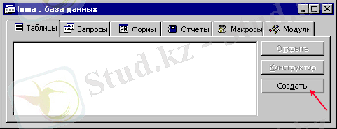 “Деректер қоры” терезесінде “Кесте” батырмасын таңдап, “Құру” батырмасын басыңыз.