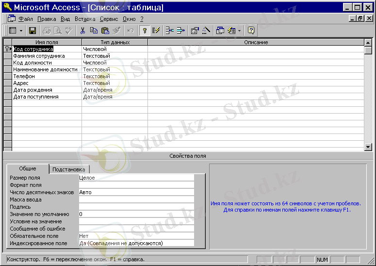 Кесте Конструкторы терезесінде әрбір өріс үшін оның аты мен типін көрсетеміз.