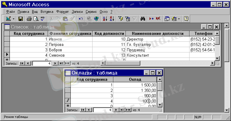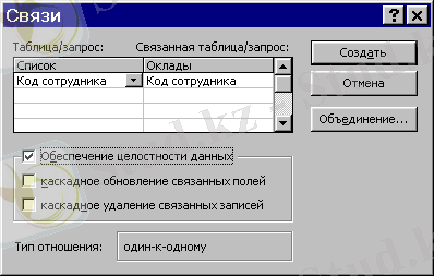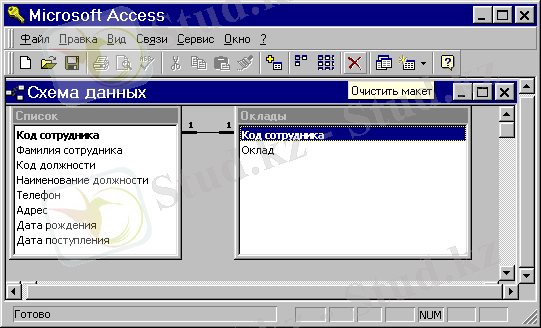 “Список” және “Оклады” пайда болады, олар “бірдің-бірге” қатынасымен байланысқан. Бұл жағдайда бір кестедегі әрбір жазба келесі кестедегі тек бір жазбаға сәйкес келеді (Сурет 2. 1) .
