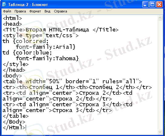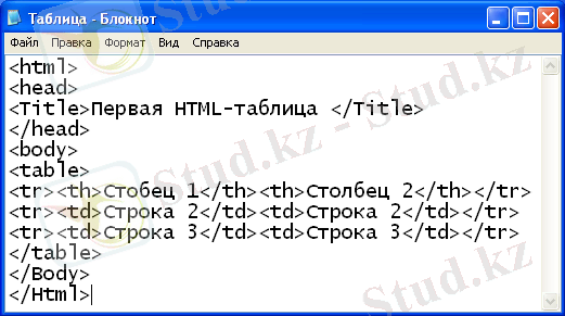 Мысалы: Үш қатар және екі бағаннан тұратын HTML кестесін тұрғызу кодын қарастырайық (8-сурет) :