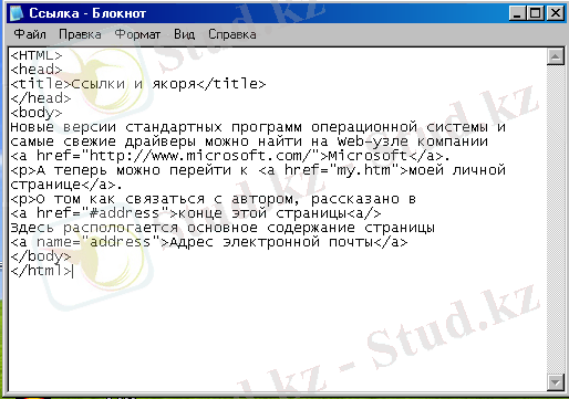 15) Гипермәтіндік сілтемелер бет ішінде арнаулы орынды да көрсетеді. Ол үшін алдын-ала якорь енгізу керек. Бұл кезде <A NAME= « . . . » ID= “…”>, </A> тегтері қолданылады. Берілген якорға сілтеме жасау үшін URL адрестің соңында якордың атын құжат атынан «#» символы арқылы ажырата отырып көрсету керек.