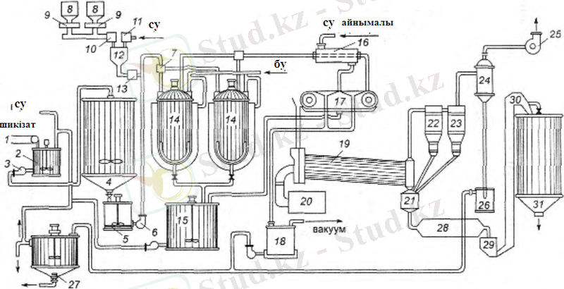 1-қабылдау бактары; 2-ортадан тепкіш насос; 3-барабанды вакум фильтр; 4-дайындау бактары; 5-ортадан епткіш насос; 6-автоклав; 7-тоңазтқыш, 8-ваккум фильтр; 9-тура нүктелі кептіргіштер; 10-аралық силостар; 11-дайын өнім силосы, .