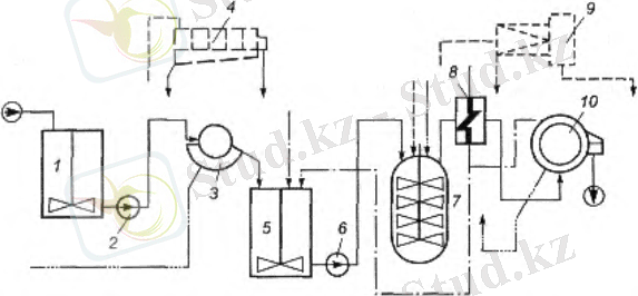 1-араластырғыш пен бірге резервуар; 2-насос; 3-барабанды вакум; 4-флотация; 5-жылумен бірге сөндіргіш; 6-насос; 7-автоклав, 8-жылуалмасу; 9-центрифуга.