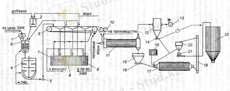 - майда ұнтақтайтын валдар; 2- қоспа бункері, 3-репульпатор; 4-шығыс бункері; 5-ортадан тепкіш насос, 6-ваккум фильтр; 7, 8, 9 - барометрлі жинақ; 10- майда ұнтақтайтын валдар; 11- кептіргіш барабан; 12- қолды фильтр; 13- желдеткіш; 14-пневмо насос; 15- аралық насос; 16-