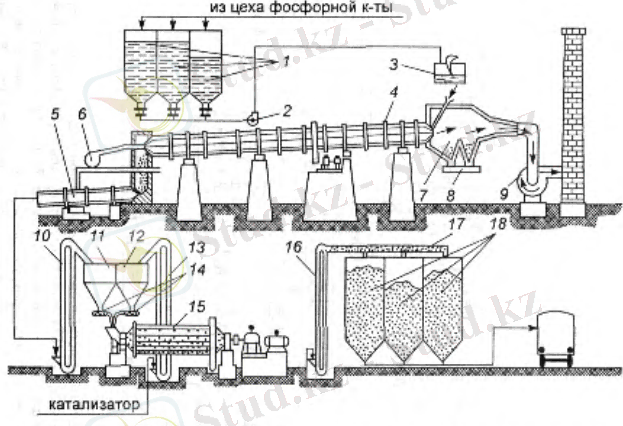 1 - аралық сыйымдылықтар; 2 - ортадан тепкіш сорғы; 3 - қоректендіргіш; 4 - айналатын пеш; 5 - атанақты тоңазытқыш; 6 - желдеткіш; 7 - циклон; 8 - шаңды жоюға арналған шнек; 9 - түтін сорғыш; 10, 13, 16 - элеваторлар; 11, 12 - бункерлер; 14 - қоректендіргіш; 15 - шарлы диірмен; 17 - шнек; 18 - сүрлем.