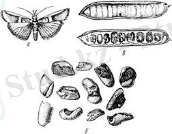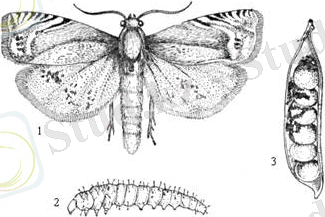 - Laspeyresia nigricana F. (Tortrisidae -тұқымдасы, Lepidoptera - қабыршақ қанаттылар отряды) . Есейген құрттардың денесінің ұзындығы - 12 мм, ақшыл сары, басы қоңыр түсті болып келеді. Денесін түк пен сүйел жапқан. Есейген құрттар пілләнің ішінде топырақта қыстайды. Көбелектер ымырт түскен кезде ұшады да, өсімдіктің жер бетіндегі мүшелеріне жұмыртқаларын салады. Құрттардың дамуы дәннің ішінде өтеді. құрттар топырақтың арасына піллә торын түзіп, сол пілләнің ішінде қыстап шығады. 1-2 ұрпақ беріп дамиды. Құрттар көбінесе бұршақты кейбір жағдайда сиыр жоңышқаны, чинаны зақымдайды. Бұршақтың ішіне еніп, дәнді кеміреді. [3]
