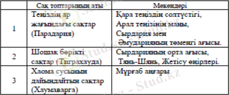 Сақтар б. з. д. І мыңжылдықта Орта Азия мен Қазақстан, Шы-ғыс Түркістан жерін мекендеген ежелгі тайпа. Ежелгі заманда Орта Азия өңірін мекендеген сақ тайпалары туралы тарихи де-ректер сол замандағы парсы және грек авторларының жазба де-ректерінде сақталған. Жалпы, сақ атауының мағынасы жайында әртүрлі пікір бар. Мысалы, “сақ” сөзінің мағынасын парсы жаз-баларында “ Құдіретті еркектер ” деп түсіндіреді, ал Иран жаз-баларында “Жүйрік атты турлар ” деп атайды. Ежелгі грек авторлары сақтарды “Азиялық скифтер” деп атаған.