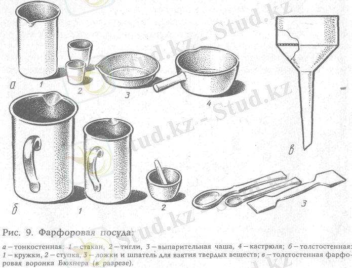 Лабороториялық жұмыстарда пайдаланылатын фарфор ыдыстардың түрлері онша көп емес. (тигельдер, чашкалар, ступкалар, Бюхнер воронкасы, фарфор стакандар, фарфор қайықшалар т. б )
