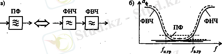 Арналық фильтрлер жиіліктің бір жақ бөлігін ерекшелеу үшін жасалған: тасымалдау бөлігінде амплитудалық модульденген сигнал арнасы, қабылдау бөлігінде - топтық спектр сигналы. Топтық фильтрлер қабылдау және тарату процесі кезінде белгілі жиіліктерді белгілеу үшін қоданылады. Топтық және каналдық сүзгіштер негізінен жолақты болып келеді. ТЖ және ЖЖ сүзгіштерін тізбектей қосу арқылы ПФ - ты алуға болады. ТЖС және ЖЖС өшу қосындысы ПФ өшуіне тең болады. (1. 2 б) а пф (ƒ) = а нф (ƒ) + а вф (ƒ)