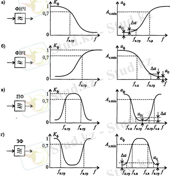 АЖС байланысты фильтрлер төменжиілікті (ФНЧ) және жоғары жиілікті (ФВЧ) ; жолақтық (ЖФ) және бөлгіш фильтрлер (БФ) болып бөлінеді. Нормаланған К ф тарату және а ф = - 0lgK ф өшу коэффициенті үшін олардың жиіліктік сипаттамалары және бейнелері 1. 1 суретінде көрсетілген. Мысалы, ФНЧ үшін (сурет 1. 2, а) жиілік облысы ƒ З, В -дан -ға дейін өшірілед, ЖФ үшін - бұл облыстар (0; ƒ 3, Н ) және(ƒ З, В ; ∞) (сурет 1. 1, в) .