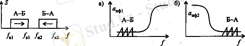 Ал, ТЖС және ЖЖС параллел қосу арқылы бөгетеуші фильтр аламыз. ЗФ тарату коэффициенті ФНЧ және ФВЧ тарату коэффициенті қосындысына тең К пф (ƒ) =К нф (ƒ) +К вф (ƒ) (сурет 1. 3, б) . Бағыттаушы фильтрлер (НФ) әртүрлі жиілік облыстарын бөледі. Оларға А-Б және Б-А бағытында 2 жолақты жүйелерде сигналды тарату немесе қабылдау кезінде қолданылады (сурет 1. 4) .