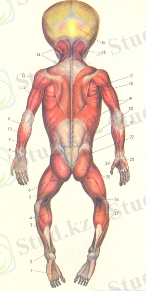 1 - табан сіңірліқабығы (апонев-роз) ; 2 - өкше (Ахиллов) сіңірі; 3 - камбалатәрізді бұлшықет; 4 - нағыз балтыр бұлшықеті; 5 - санның екі-басты бұлшықеті; 6 - санның бүйір жалпақ бұлшықеті (санның текше бұлшықеті) ; 7 - басбармақты жаза-тын ұзын бұлшықет; 8 - жазатын бұлшықеттердің сіңірлі ұстағышы; 9 - саусақты жазатын бұлшықет-тер; 10 - шынтақтың қолбасын жа-затын бұлшықет; 11 - тоқпан-шы-бық бұлшықеті; 12 - қардың үшбас-ты бұлшықеті; 13 - делта бұлшықе-ті; 14 - трапеция тәрізді бұлшықет; 15 - шүйде-маңдай бұлшықеті, шүй-де бұлшықетінің қарыны; 16 - төс-бұғана-емізік бұлшықеттері; 17 - жота (қыр) асты бұлшықеті; 18 - жұмыр кіші бұлшықет; 19 - арқалық ең жалпақ бұлшықеті, 20 - құрсақтың сыртқы қиғаш бұлшықеті; 21 - бел үшбұрышы; 22 - орта бөксе бұлшықеті, 23 - шынашақ үстірті (гипотенар) ; 24 - басбармақүстірті (тенар) ; 25 - үлкен бөксе бұлшықеті; 26 - тақым бұлшықеті; 27 - балтырдың үшбасты бұлшықеті.