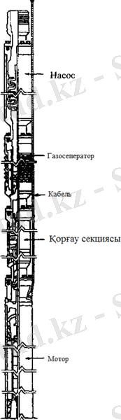 ЭОСҚ құрамы және комплектісі. ЭОСҚ қондырғысы батырмалы сорғыш агрегатынан (гидроқорғанысты электроқозғалтқыш), кабельді линиядан, СКҚ колоннасынан, ұңғымалық саға жабдығынан және жер үсті электр жабдықтарынан: трансформатор және басқару станциясынан(комплекті қондырғы) тұрады. (сурет1. 3) . Трансформаторлы подстанция өнеркәсіптік жүйедегі кернеуді кабельдағы кернеу түсуін есепке ала отырып электрқозғалтқыш қысқышындағы кернеуді оптималды өлшемге дейін өзгертеді. Басқару станциясы оптималды режим кезіндегі сорғыш агрегаттарының жұмысын және қорғанысын басқаруды қамтамасыз етеді.