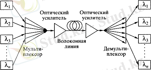 1-сурет. Спектральды тығыздау арнасы бар талшықты- оптикалық байланыс жүйесінің принципиальды схемасы