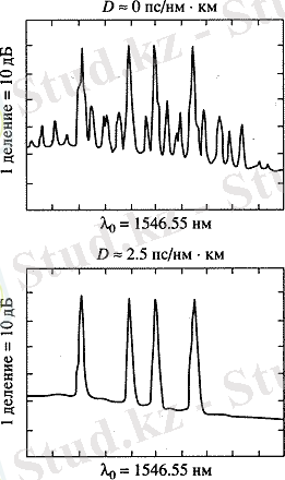 2 - суретте осы процесте дисперсияның рөлін көрсетеді. D = 0 және D=2, 5пс/нм• км дисперсиясы бар талшықты жарықжетегіштер әрқайсысының қуаты 2 мВт болатын төрт спектральды арнаның сәулеленуін енгізеді. Оптикалық талшықтың ұзындығы 50 км-де (неғұрлым ұзағырақ жарықжетегіштер, сызықты емес процестердің тиімділігі жоғары) нөлдік емес дисперсиямен, қосымша толқын ұзындығы байқалмайды (4-толқынды араластыру есебінен) . 25 км ұзындығы нөлдік дисперсиясы бар жарықжетегіштерде 4 толқынды араластыру тиімді жүргізіледі және 20-дан астам толқын ұзындығы анық көрінеді. Осыдан спектральды тығыздау арнасы бар талшықты жарықжетегішке қойылатын талап шығады - сәуле өткізуі толқын ұзындығында нөлге дейінгі (бірақ тым үлкен емес) дисперсия, бұдан дисперсия ұзындығын өлшеу толқын ұзындығынан ең аз болуы тиіс (спектрлі арна байланыс жүйесі үшін ақпарат беру жылдамдығын арттыруға нөлдік дисперсия жарықжетегіш қажет болды, сондай-ақ осындай жарықжетегіштер әзірленді: жарықжетегіш құрылымы үшін нөлдік дисперсия толқын ұзындығы салдарынан 1, 3 мкм-ден-1, 55 мкм толқын ұзындығы арасында сырғыған) .