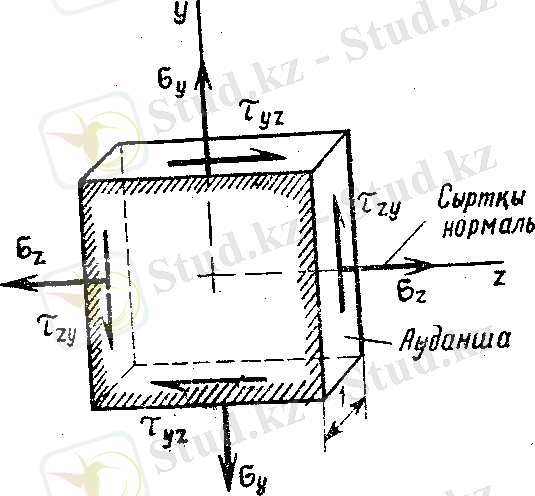 Жүктелген дененің кез келген нүктесінің жанынан өзара перпендикуляр үш беттеріндегі жанама кернеулері нольге тең болатын элементар параллелепипед бөліп алуға болады.
