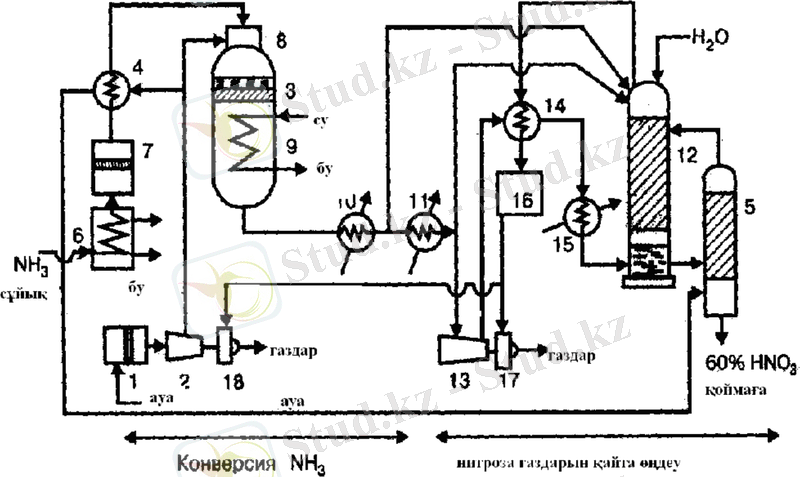 1 - ауа фильтрі; 2 - каталитикалық тазалау реактор; 3 - жану қондырғысы; 4 - метан жылытқышы; 5 - аммиак жылытқышы; 6 - фильтрі бар аммиак ауа араластырғышы; 7 - тоңазытқыш-конденсатор; 8 - сепаратор; 9 - абсорбциялық колонна; 10 - үрлеу колонна; 11 - қалдық газдарды жылытқыш; 12 - ауа жылытқышы; 13 - нитрозды газдарды тотықтыру түтікшесі; 14 - контактілі аппарат; 15 - қазан‑утилизатор; 16, 18 - екі сатылы турбокомпрессор; 17 - газды турбина
