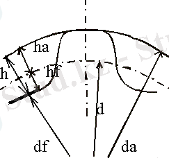 h f =(d-d f ) /2=(mz-mz+2, 5m) /2=1, 25m;Тістер шыңы шеңбері және тістер ойысы арасындағы қашықтықты тіс биіктігі деп атайды, ол тіс басының биіктігімен кішкене аяғының биіктігіне қосындысынан шығады: