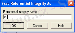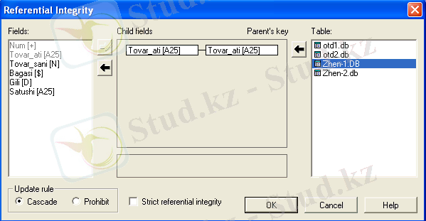 Fields панелінен керек деген өрісті таңдап аламыз. Стрелкасы бар кнопка арқылы сол өрісті Child Fields қосымша кестелер тізіміне қосамыз. Осыдан кейін ОК кнопкасын басамыз. Нәтижесінде суретте көрсетілген терезе ашылады. Сілтеме деңгейіндегі бүтінділік сақталады.
