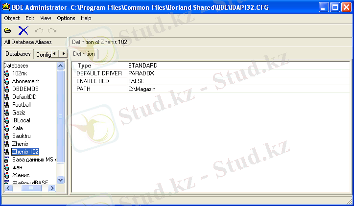 Databases-мәліметтер қоры және Configuration- конфигурация. Сол жақ панельде мәліметтер қорының жалған аттарының бұтақшасын көре аламыз. Кез келген бір жалған атты ерекшелеп, оң жақ панельде Definition драйвері сипаттамаларын көре аламыз. Paradox мәліметтер қоры үшін Standard драйвері қолданылады және минималь сипаттамалары: Type-драйвер аты, Path- мәліметтер қорына жол. Path параметрлерін ерекшелеп көп нүктелі кнопканы көреміз. Ол кнопканы басқанда жаңа каталогын таңдауға мүмкіндік беріледі.