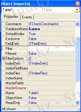 Бұл кестедегі жобадағы компаненттер мен МБ-дағы мәліметтер базасындағы кестелердің байланысы және де сол компанентерге қолданылатын қасиеттер көрсетілген.