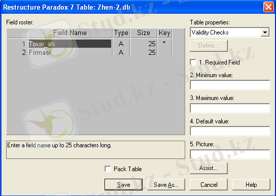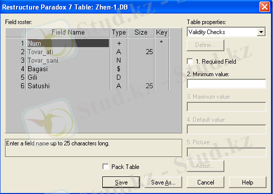 Validity Checks - бұл қасиет кестенің мәндерінің дұрыстығын тексереді. Бұл бөлімнің оң жақ терезесі 1. 2 - кестеде көрсетілген және өрістік типіне қарай өзгеріп отыруы мүмкін: