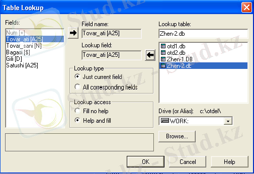 Table Lookup - бұл бөлім берілген кестенің өрісін басқа көрсетіліп отырған кестенің өрісімен байланысын көрсетеді. Бұл терезеде драйверлер мен пвседонимдерді қолдана аламыз. Table Lookup таңдап алғанда терезеде Define-анықтау кнопкасы ғана көрініп тұрады. Осы кнопканы басып келесі терезені ашамыз: