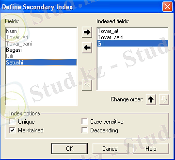 Жаңа индекс құру үшін Define- анықтау батырмасын басу керек. Бұл батырманы басқанда көру диалогтық терезесі ашылады. Оның сол жақ терезесінде Fields қатынау өрістерінің тізімі көрсетілген, ал оң жақ терезесінде Indexed fields екінші индекс болатын өрістер көрсетіледі.