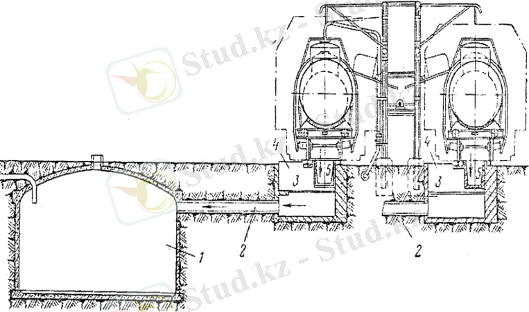 1 - төменнен құю қондырғысы, 2 - жоғарыдан құю қондырғысы, 3 - коллектор, 4-сорап, 5-нөлдік резервуар.