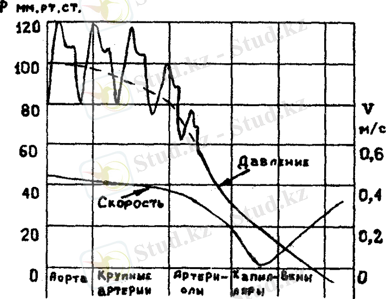 Қан айналу жүйесінде қан қысымы мен жылдамдықтың таралуы 2-суретте көрсетілген (жоғарыдағы қисық) .