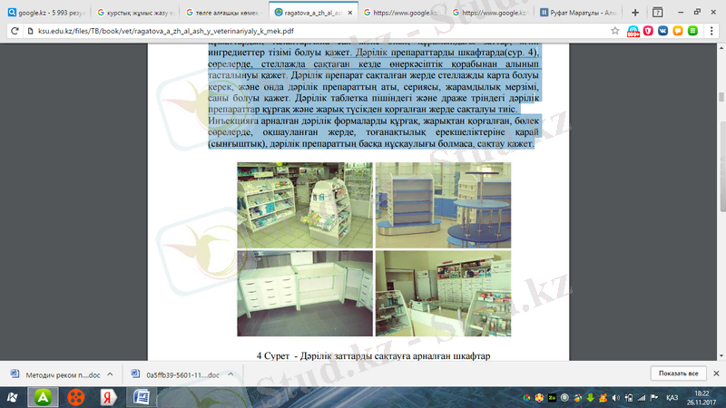 Дәрілік препараттардың сипаттамасының ерекшеліктері. Дәрілік препараттарды сақтау Мемлекеттік фармокопия мен нормативті-техникалық құжаттардың талаптарғына сай және оның құрамындағы заттар, яғни ингредиеттер тізімі болуы қажет. Дәрілік препараттарды шкафтарда(сур. 4), сөрелерде, стеллажда сақтаған кезде өнеркәсіптік қорабынан алынып тасталынуы қажет. Дәрілік препарат сақталған жерде стеллажды карта болуы керек, және онда дәрілік препараттың аты, сериясы, жарамдылық мерзімі, саны болуы қажет. Дәрілік таблетка пішіндегі және драже тріндегі дәрілік препараттар құрғақ және жарық түсікден қорғалған жерде сақталуы тиіс. Инъекцияға арналған дәрілік формаларды құрғақ, жарықтан қорғалған, бөлек сөрелерде, оқшауланған жерде, тоғанақтылық ерекшеліктеріне қарай (сынғыштық), дәрілік препараттың басқа нұсқаулығы болмаса, сақтау қажет.