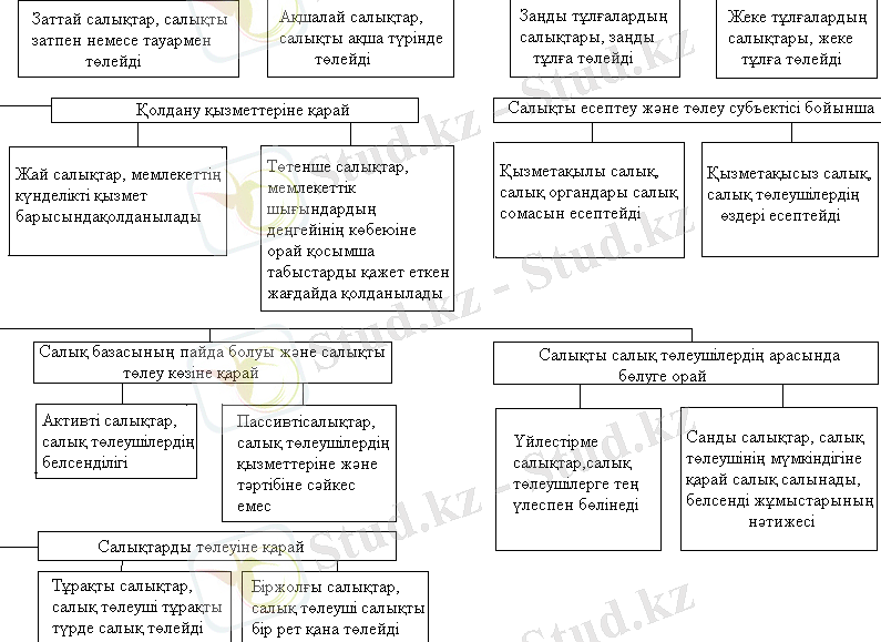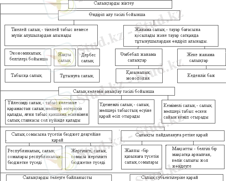 - салықтар бюджеттің қай түріне бекітілген (республикалықжәне жергілікті), яғни мемлекеттік салықтар республикалықбюджетке, жергілікті салықтар жергілікті бюджетке түседі;