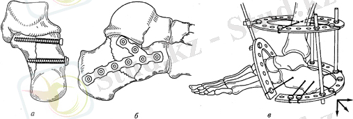 Оперативті ем. Ашық әдіс-енгіш фиксаторлардың көмегімен жүргізіледі (біз, винт, сүйек трансплантаттары, моделдеуші пластиналар) Жақсы нәтижені сыртқы бекітуші аппараттар береді, себебі оның көмегімен ығысуды қалпына келтіреді және аяққа ерте күш түсіруге болады(9 сурет)