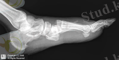 Радиологиялық диагностика : Маңызды рольді табан мен сирақтың сүйек-буын аппаратының жағдайы атқарады. Тиімді әдіс рентгенологиялық. Шеткі функциональді жағдайда табанның рентгенографиясы қолданылады. Рентгенологиялық зерттегенде бұрыштық көрсеткіштеріне мән беру керек(12 сурет)