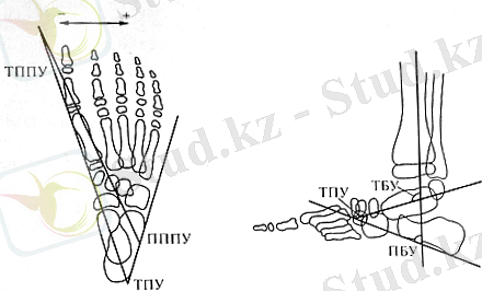 2. топай-бірінші табан(ТППУ) және табан-бірінші табан(ПППУ) бұрыштары рентгенограммада тура проекцияда анықталады. Бұл бұрыштарды топай және табан сүйектерінің осіне сәйкес өлшейді. Егер бірінші табан сүйегінің осі жоғарыда айтылған сүйектердің осінен медиальді ауытқыса, онда бұрыш мөлшері минус таңбасымен белгілейді, егер латеральді плюс. Бұл бұрыштардың мөлшерінің салыстырмалы түрде аздап және айқынырақ азаюы табанның алдыңғы бөлігінің әкелінгенін білдіреді және көлденең табан сүйегі алды(Шопар) буынында табанның ішкі тайқуын анықтайды.
