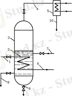 1- бірінші ретті судың келуі; 2- жылытқыш секция; 3- буландырғыш корпусы; 4-екінші ретті будың әкетілуі; 5- конденсатор; 6- конденсаттың әкетілуі; 7- ауыз суын әкелу; 8- төгу; 9- босату; 10- дистиляттың әкетілуі.