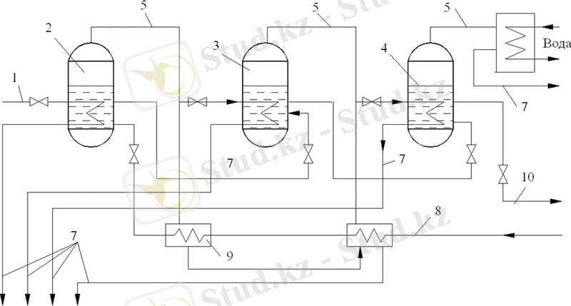 1 - желі келтіру греющего бу; 2, 3, 4 - буландырғыш тиісінше 1 . . . 3-ші сатысы; 5 - қайталама бу бұру желісі; 6 - конденсатор; 7 - линия конденсатты; 8 -қоректік су жеткізу желісі; 9 - қоректік су жылытқыш; 10 - үрлегіш желі