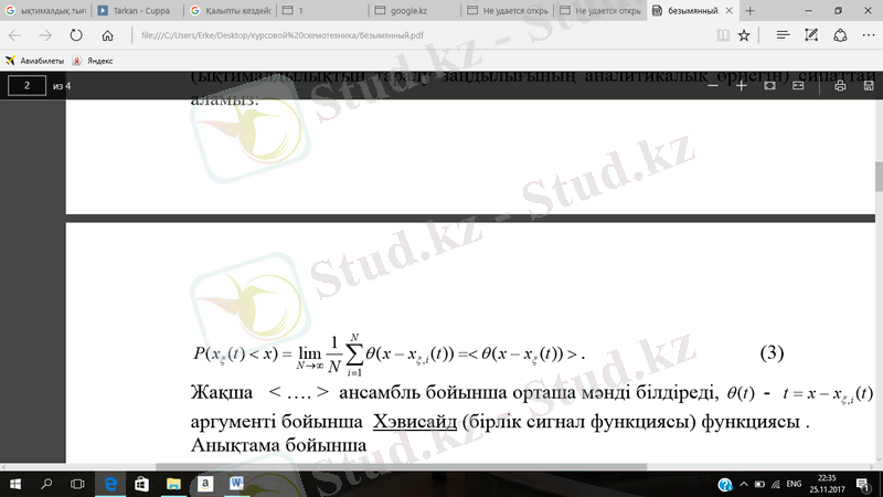 Үздіксіз кездейсоқ сигналдар үшін ықтималдылықтың (6), (7) анықтамасын дəлірек алу қажет. Себебі, үздіксіз шамалар шексіз (есепсіз мəндер) мəндердің жиынын қабылдайды, сондықтан t i уақыты нөлге тең болғандықтан P i де нөлге тең болады. Осы себепті кездейсоқ шаманың болатын мəндерінің белгілі интервалын қарастыру керек, мысалы 0< x ξ <. x. Сонда біз дискретті жағдаймен ұқсастыққа келеміз жəне үздіксіз кездейсоқ шама x(t) үшін ықтималдылықтың таралу функциясының анықтамасын (ықтималдылықтың таралу заңдылығының аналитикалық өрнегін) сипаттай аламыз: