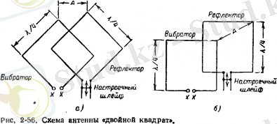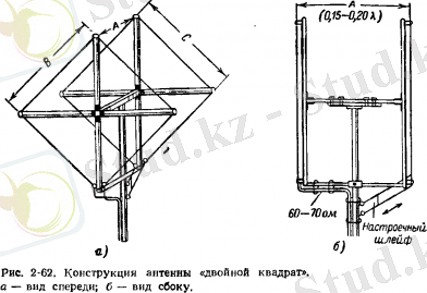 2. 1 суретте"екілік квадрат" антеннасының әдетте жұмыс жасайтын екі түрлі құрылысы. Негізгі элементі ұзындығы λ/4 және жалпы ұзындығы 1λ шаршы түріндегі вибратор болып табылады. А қашықтықта 0, 1 λ-ден 0, 2 λ ге дейін екінші дәл осындай квадрат орналастырылады, қосымша ширек төрттолқындық циклмен жабдықтылған рефлектор ретінде жұмыс істейді. Антенна элементтері тігінен (сур. 2. 1, а) немесе шаршы тараптардың бірінде (сур. 2. 1, б) орналасады. Антенна конструкцияларын өзгертпей, қуат нүктесін ауыстырған кезде, өрістің тік немесе көлденең поляризациясына қол жеткізуге болады. Екі антеннада (сур. 2. 1) өрістің көлденең поляризациясы бар.